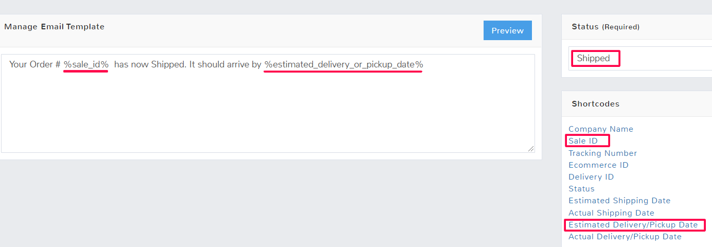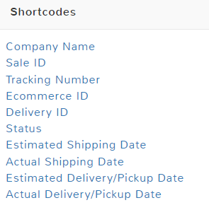 There are three main sections for delivery email templates, the status that the message will send for, the email template itself, and shortcodes to help you customize emails with customer information.