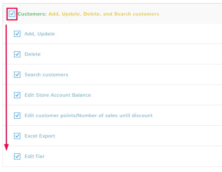Permissions are grouped by program features such as Customer, Items, etc. By default, no permissions are selected when creating a new employee. Checking a box will allow the employee to perform the action described. If you check the box at the top of a section, it will select all of the different permissions in that set.