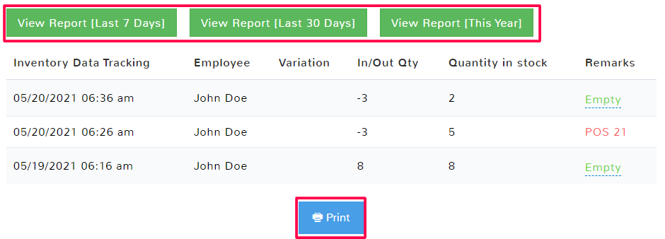 The reports section shows you any activity taken on an item’s inventory, from adjustments to inventory to sales made containing the item. You can select the time period that you would like to see the changes in, either the last 7 days, 30 days, or year. There is also the option to print out the report.