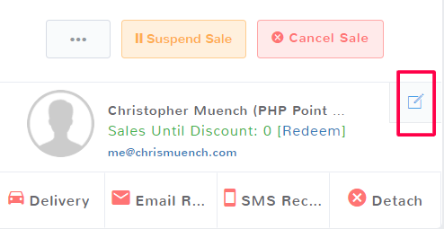First, make sure you have added the customer to the sale. Next, in the customer panel, click the box and pencil icon in the top right by the customer name.