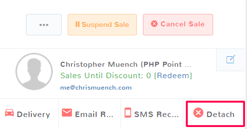 If you accidentally added the wrong customer to a sale, they can easily be removed from the record. Find the customer panel and in the bottom right of the panel, select Detach.