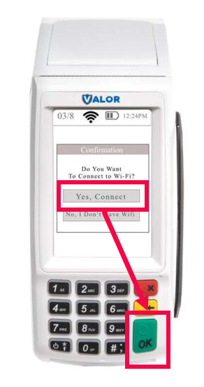 If you are connecting to WiFi, press Yes, Connect on the screen. Select your location’s SSID and enter the password button. Hit OK on the pad when done.