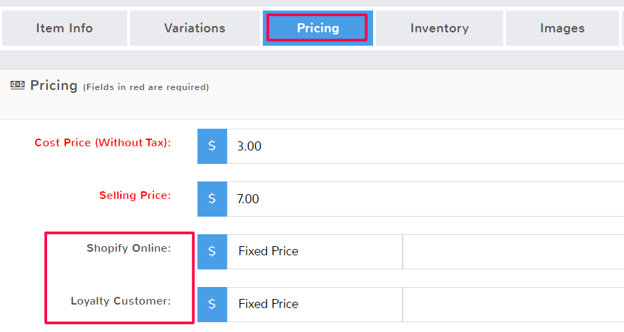 It’s important to understand, you are not creating a new price point that will override the item’s selling price during a normal sale. When you customize one of the tiers, you are only adjusting how that item’s price will be affected once the tier is triggered. For example, in the image above, changes will only affect the item when a Loyalty Customer is purchasing the item, or when the item is sold online.