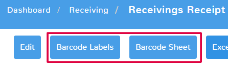 In the top menu, there are the options to create a Barcode Sheet or Barcode Labels. Whatever items are in your receiving receipt, will populate on the sheet or labels so that you can easily tag and keep track of items.