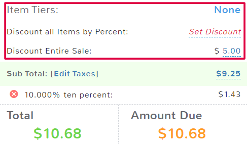 This will apply a flat percentage discount to all of your items, click Set Discount to enter the amount.. For example, if your total was 20 dollars, and you put a 10% discount, your new total will be 18 dollars.
