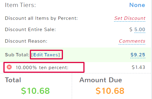 Underneath your discount options, there is an option to Edit Taxes. If there is a problem with the sale and the taxes being applied, you can remove a tax by clicking the red x next to it, or adjust your tax settings altogether. More information about tax setup can be found here.