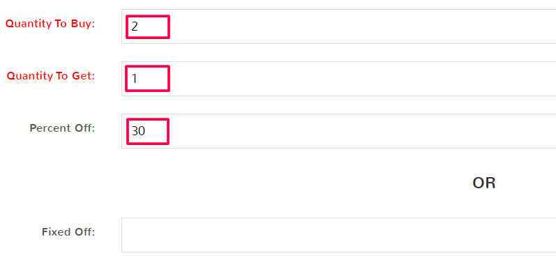 This Rule Type lets you select how many of an item a customer must purchase in order to get a discount on more of them. The Quantity to Buy is the number of an item the customer has to purchase in one sale to get a discount on the Quantity to Get of the same item in a sale. You can choose a Percent Off discount for the customer’s total, or enter a Fixed Off discount.