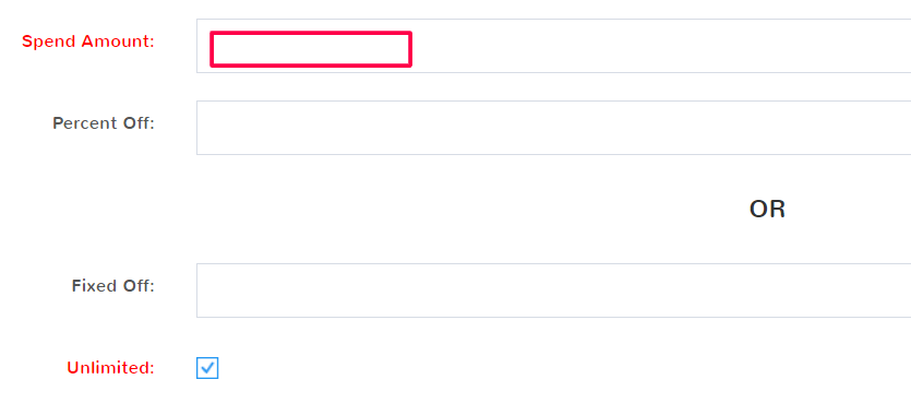 For example, a Spend Amount of $100 with a Percent off of 10% would make the customer’s total $90. The same Spend Amount with a Fixed Off of $15 dollars would leave the customer total at $85.