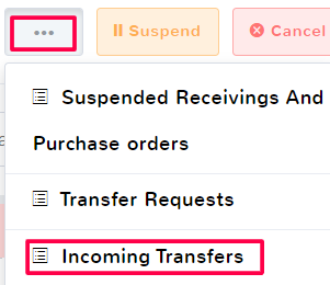 Once the page opens, click the ellipses (…) to see more options and select Incoming Transfers. This opens the Incoming Transfers page where you can see an overview of inventory transfers your location is expecting.