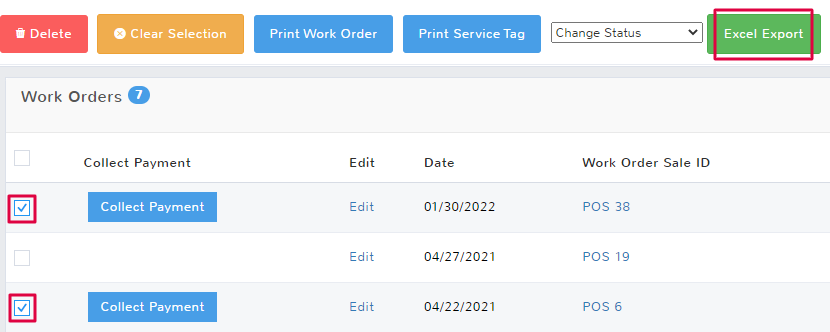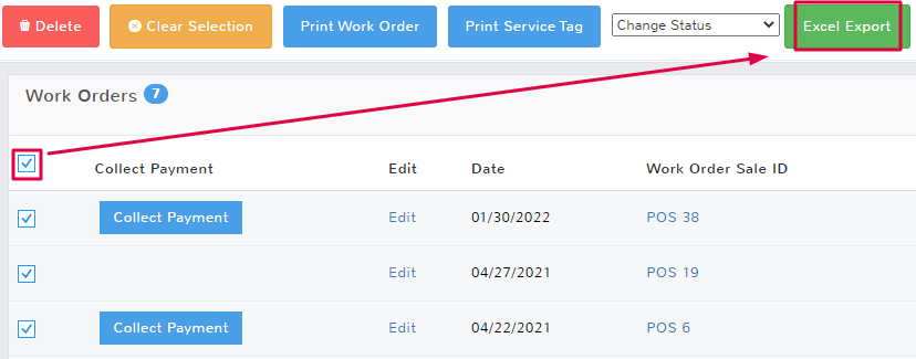 If you would like to select all of the work orders displayed in the queue, click the top checkbox to the left of the Collect Payment column header. Make sure to select Excel Export to have your file downloaded.